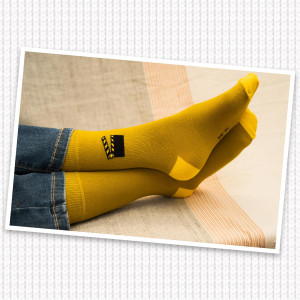 C’est ici l’emblématique « clap » qui a été choisi pour orner la cheville des chaussettes jaunes, et symboliser ainsi le monde cinématographique.