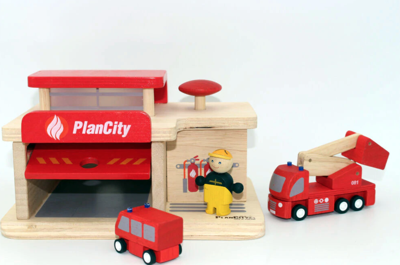 Avec cette caserne, les enfants pourront imaginer des histoires de pompiers et de pompières pendant des heures. Elle est composée d’une tour, d’un garage à porte pliée, de deux véhicules et d’une figurine en bois. Sur le toit de la caserne, un petit bouton d’urgence émet un son de cloche, pour avertir les pompiers d’une urgence.