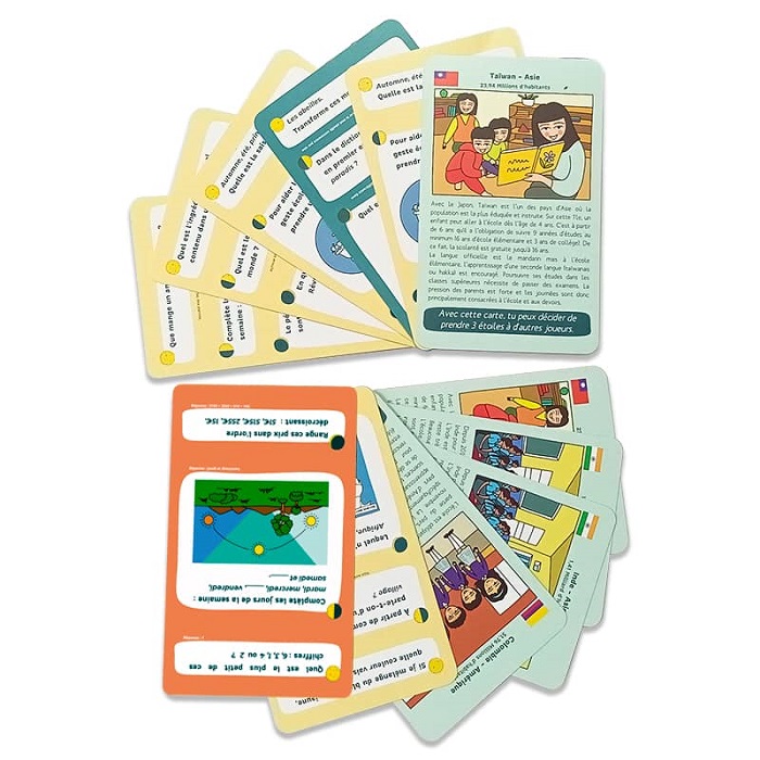 Les cartes bonus : le joueur qui remporte une carte bonus peut l’utiliser immédiatement ou la jouer plus tard quand vient son tour. Il pourra ainsi changer le jeu en cours selon les indications inscrites dessus et découvrir aussi le fonctionnement du système scolaire dans d’autres pays du monde.