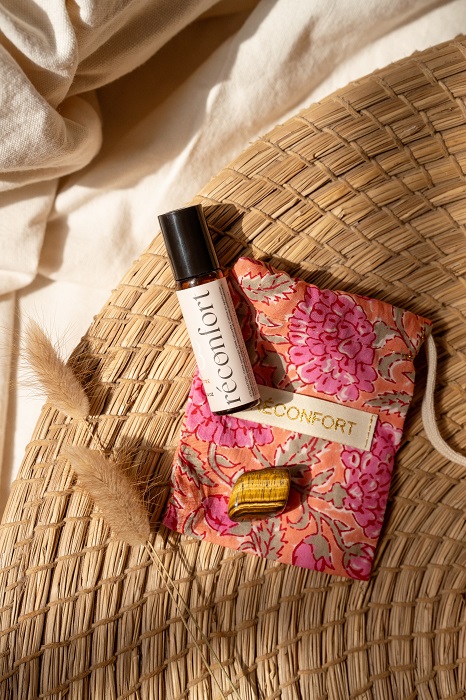 Chaque roll-on a été co-créé avec une naturopathe spécialisée en aromathérapie. Ils sont vendus à l’unité ou accompagnés d’une pierre dans un joli pochon indien cousu main au fil doré.