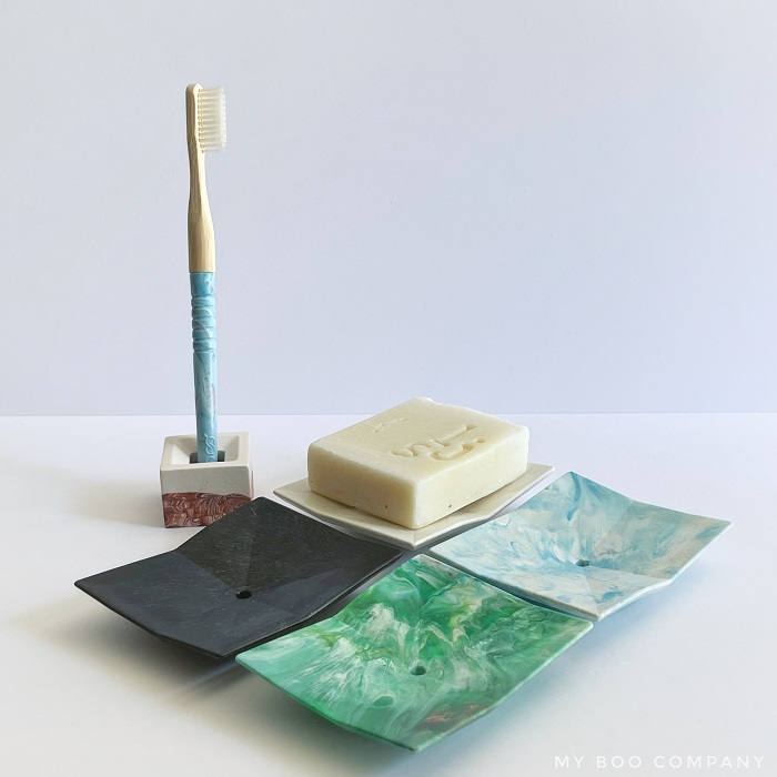 Sa particularité ? Le manche de la brosse à dents et le porte-savon Origami sont conçus à partir de déchets plastiques.