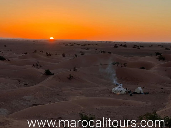 Après le petit déjeuner au Bivouac, démarrage de la rando entre les replats et dunes. À la mi-journée, on s’arrête pour le repas et la sieste. Bivouac du soir est dressé à Erg Ras Rich (lieu sacré où l’on trouve des fossiles datant d’avant l’arrivée des humains). Votre cuisinier vous y préparera un bon plat traditionnel cuit sur le feu de bois. Soirée sous le ciel étoilé au son des musiques traditionnelles nomades et des chants sacrés. Nuit à la belle étoile (possibilité de loger sous la tente commune si souhaité).