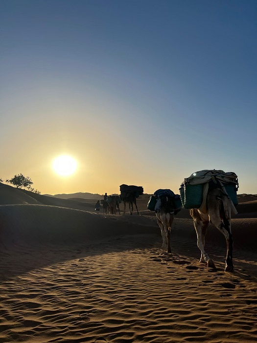 Petit déjeuner tranquille sur la terrasse de votre Riad et départ en taxi privé climatisé (ou mini bus confort en fonction du nombre de participants) par la route du col de Tizin Tichka jusqu’à Ouarzazate. Vers midi, dégustation d’un succulent Tagine. La route se poursuit le long de la vallée verdoyante du Draa jusqu’à Zagora. Nombreux arrêts pour profiter des surprenants paysages variés de l’Atlas. Poursuite de la route vers Mhamid jusqu’au bivouac pour rencontre avec l’équipe chamelière et première soirée et nuit à la belle étoile.