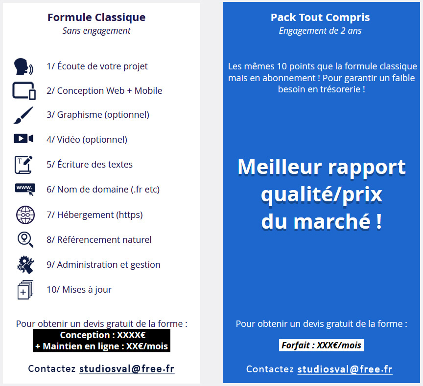 Convaincu de ses tarifs, StudiosVAL vous invite à faire vos propres comparatifs. Car il ne faut pas oublier qu’un site normal se gère comme un loyer avec plusieurs forfaits mensuels :
