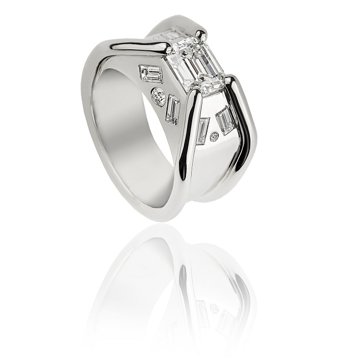 Chicissime, elle est composée d’un diamant central taille émeraude réhaussé de diamants taille baguette et taille brillant, sertis sur platine.
