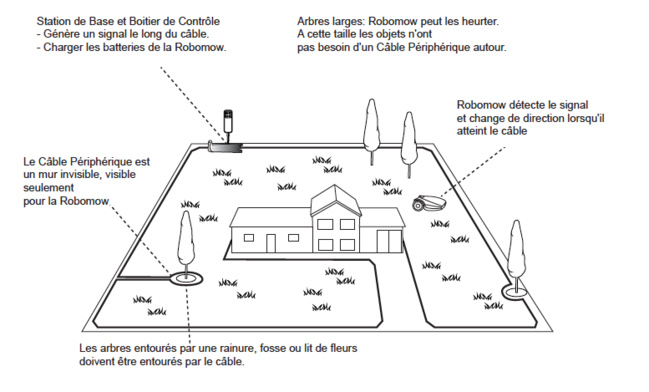 Si la tondeuse robot est entièrement autonome, elle nécessite néanmoins avant sa première utilisation, une installation et une configuration adaptées au terrain. Pour se repérer, la tondeuse recherche en effet un signal électrique. Celui-ci est émis par un câble électrique basse tension installé tout au long du périmètre du jardin et autour de certains obstacles à protéger tels que les parterres de fleurs, les bassins, etc.