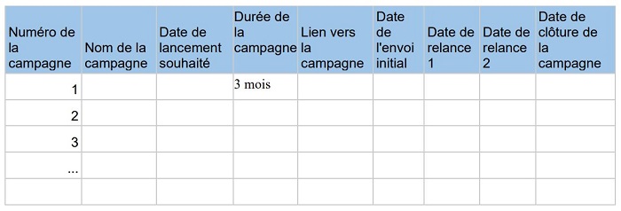 Le calendrier doit contenir au minimum les éléments suivants : la date de lancement de chaque campagne, sa durée, son sujet, et la cible visée.