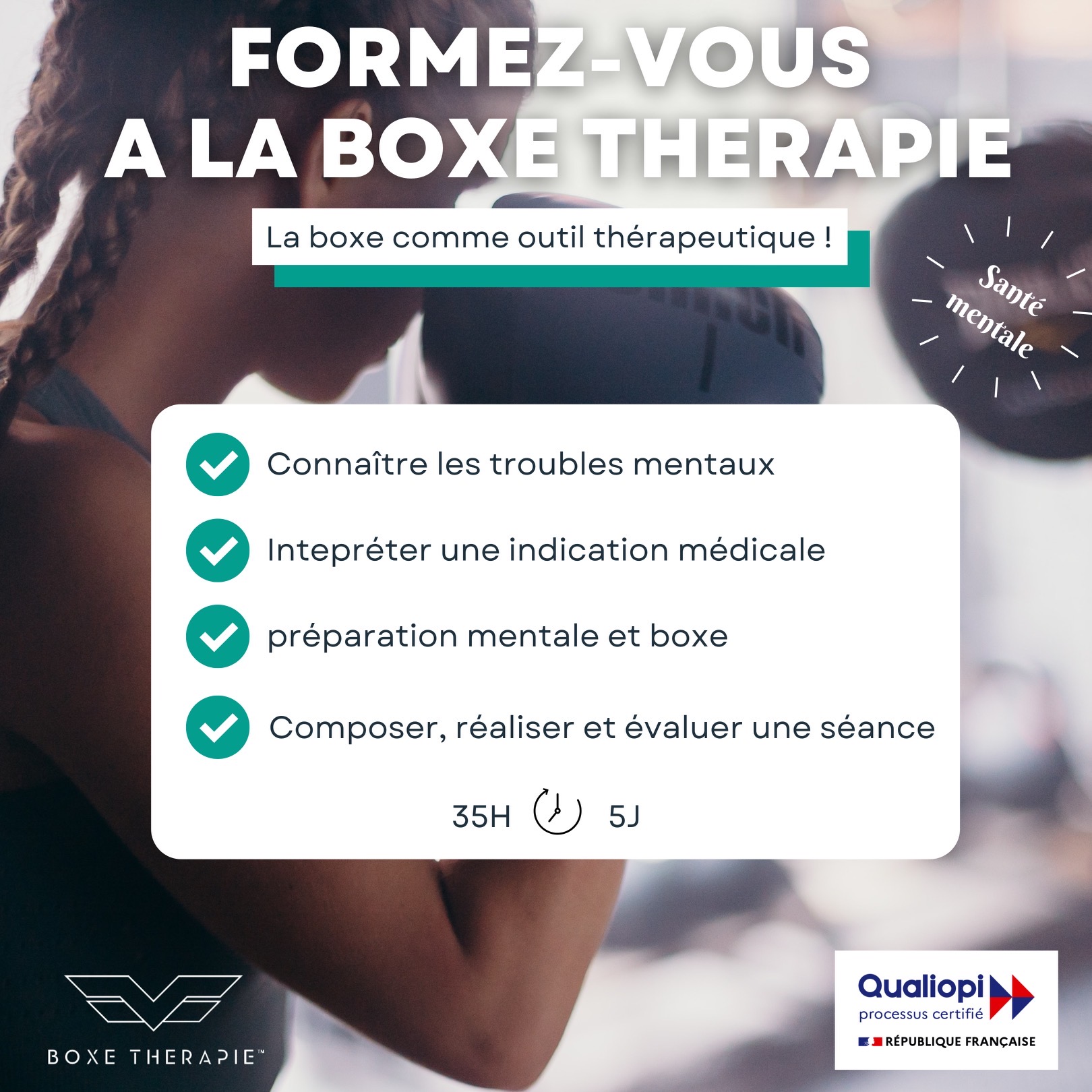 Cette formation apprend aux participants à utiliser la boxe comme outil thérapeutique pour la santé mentale. Elle s’adresse aux personnes titulaires d’un diplôme dans le domaine médical, social ou sportif : éducateurs sportifs, psychiatres, psychologues, psychomotriciens, et infirmiers.