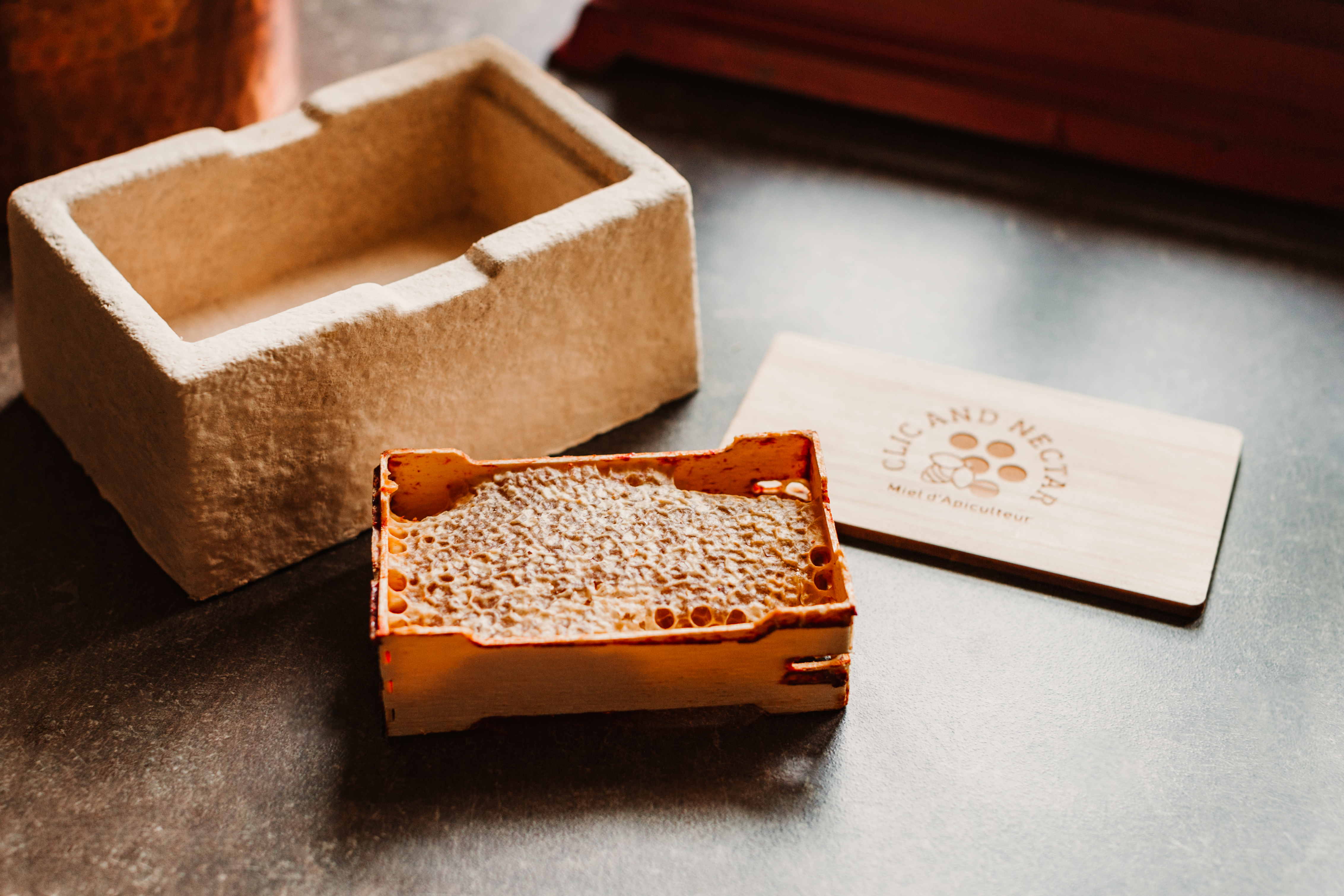 La ruche gasconne Clic and Nectar propose un miel sur cadre, « emballés » naturellement par les abeilles, et conditionné dans une box végétale cultivée en Embelium, un matériau écologique issu de la nature.