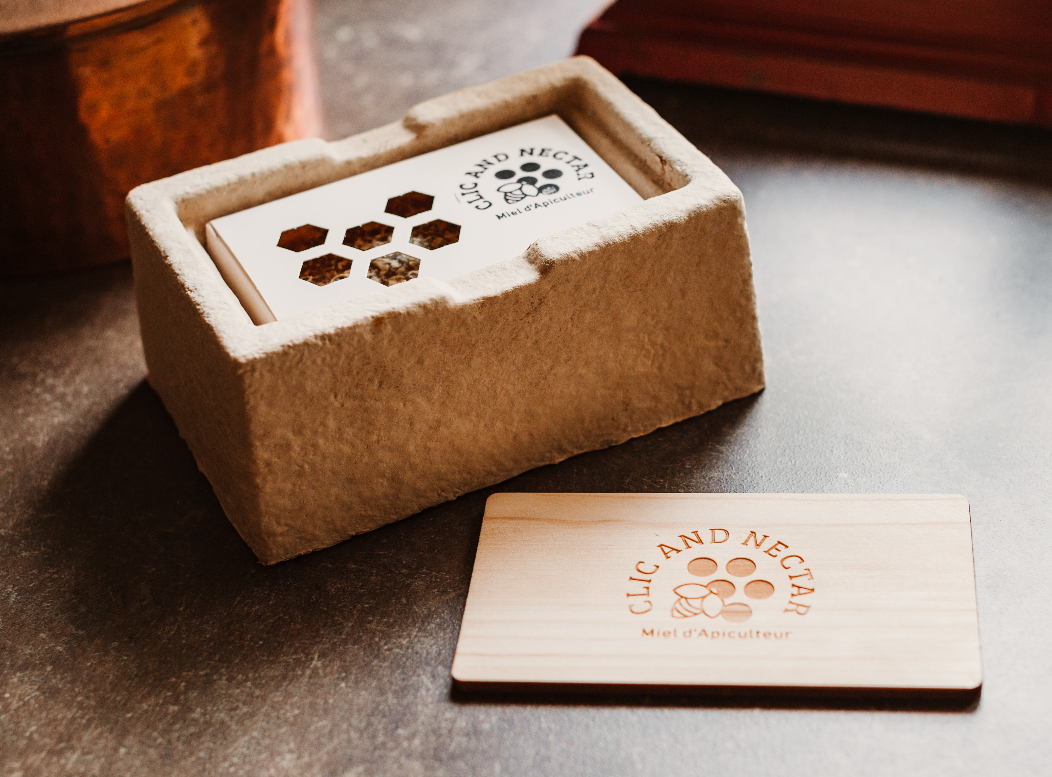 Clic and Nectar propose ses cadres de miel dans un emballage élégant et écoresponsable : une boite en Embelium. Un matériau végétal né de la terre et biodégradable.