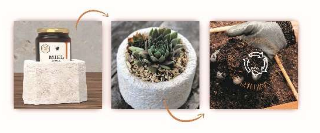 Embelium est réutilisable, modifiable et transformable. Dotée d’un couvercle en bois personnalisable, cette jolie boite au toucher doux peut connaitre une deuxième vie. Vous pourrez trouver de nombreux usages pour ces jolies boites végétales : Pot pour vos plantes, boites de rangement… Elles sont également compostables et génèrent un humus sain et fertile.