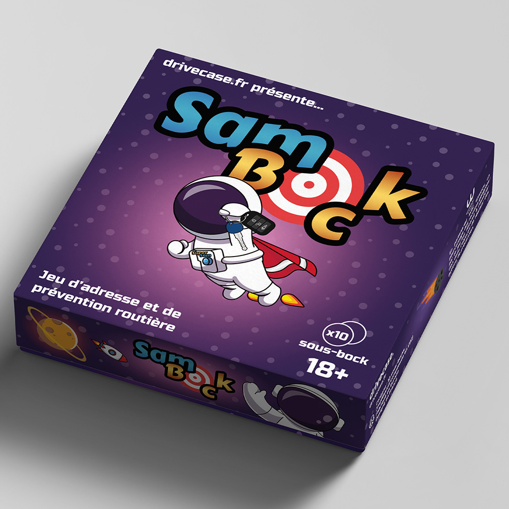 Unique sur le marché, Sam’Bock est un outil de communication et de prévention original pour les entreprises. La boite de jeu ainsi que le sous-bock « cible » sont personnalisables au logo des clients de Drivecase.