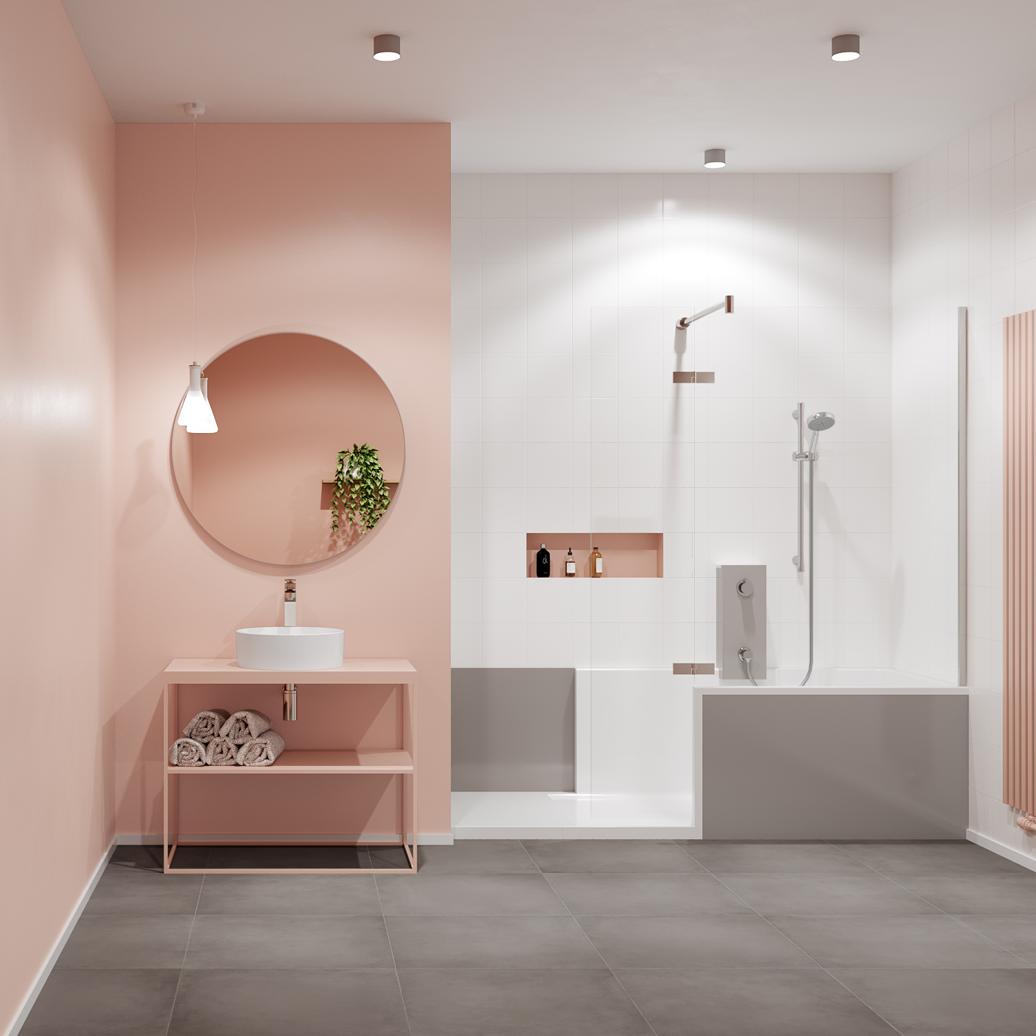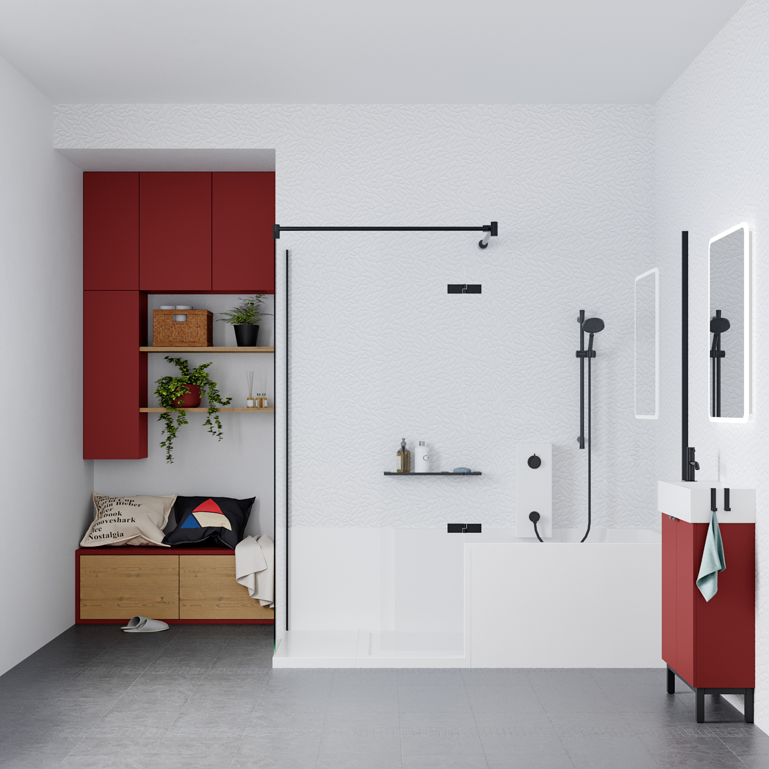 La douche occupe tout l’espace vide au sol et au mur, quelle que soit la dimension de la baignoire, et la tuyauterie est dissimulée derrière la structure. La structure monobloc brevetée de la douche assure une étanchéité parfaite.
