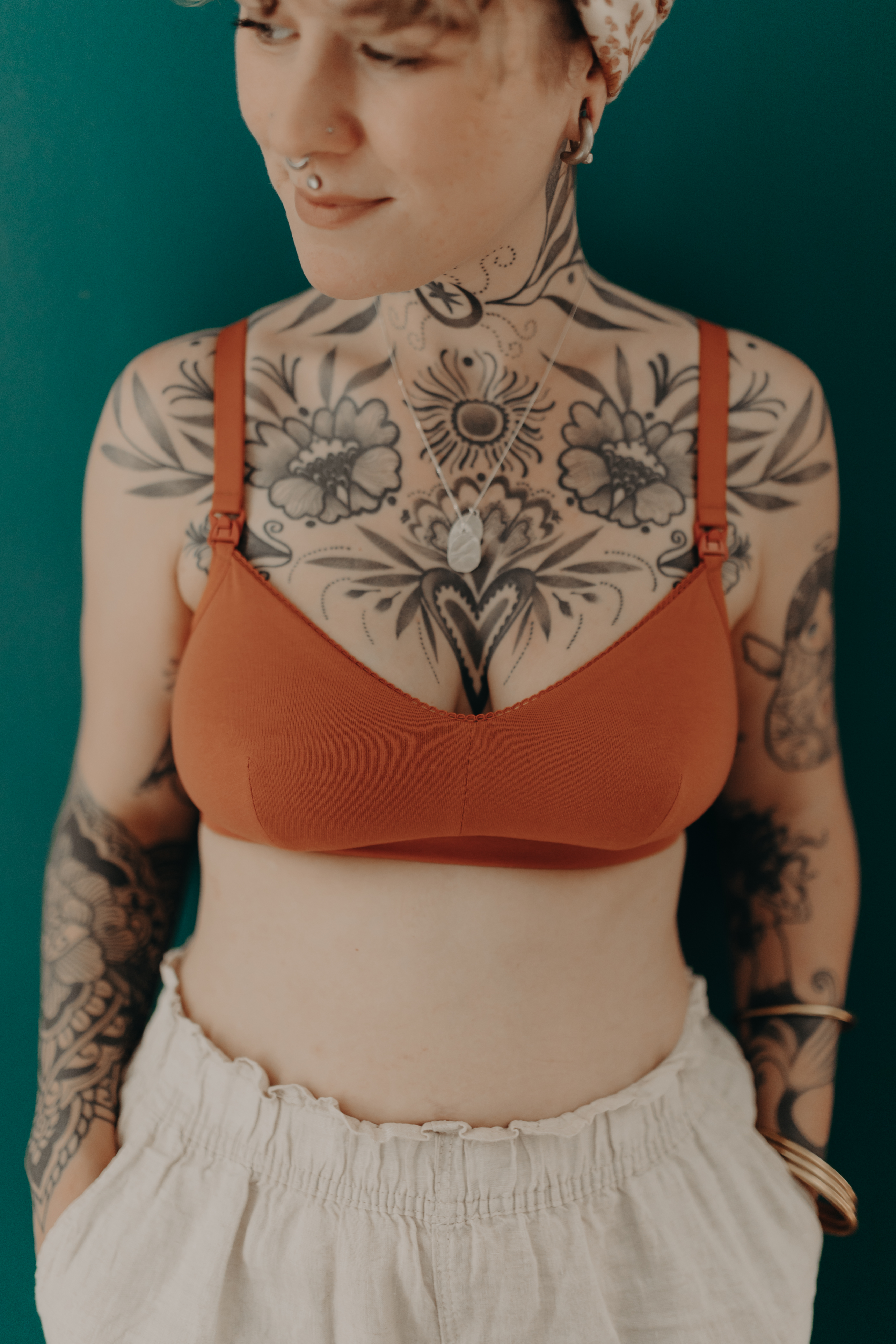 Cette brassière d’allaitement a été créé en partenariat avec la marque de vêtements d’allaitement You & Milk. Une lingerie féminine et épurée pour un allaitement libéré. Disponible dans 2 coloris : le Milk rehaussé d’un élastique doré sur le décolleté et le Terracotta avec un joli élastique picot pour un look féminin et moderne. Elle s’ouvre facilement grâce à un clip maternité sur les bretelles.