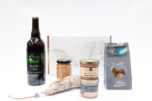 Les box contiennent un assortiment de produits salés et sucrés choisis auprès d’artisans régionaux : terrines, foie gras, tartinades, chocolats, thé d’origine, pâte à tartiner, biscuits, pain d’épice de Noël, vins de domaines, jus de fruits et autres softs naturels.