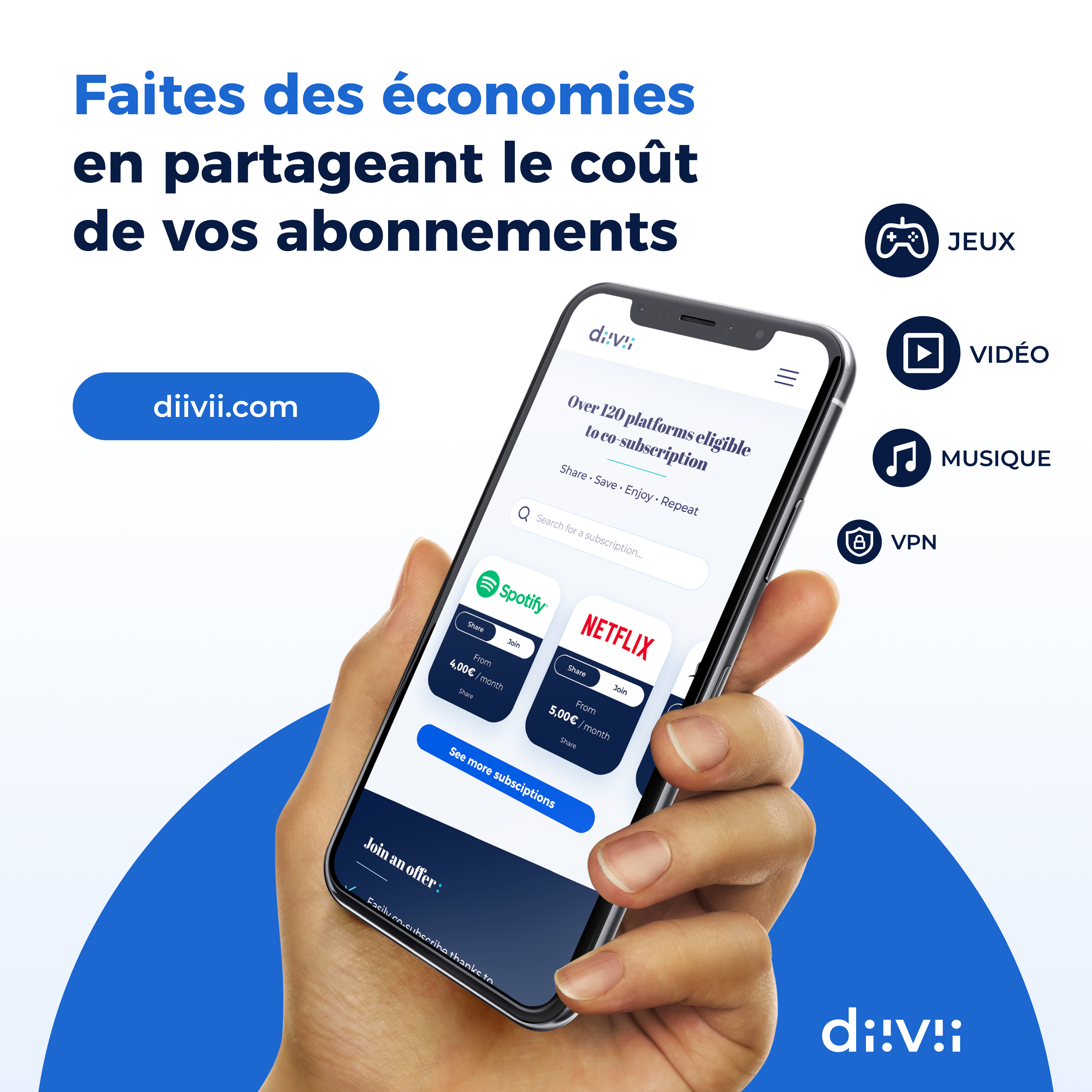 C’est justement pour redonner du pouvoir d’achat aux étudiants que deux jeunes frères lancent diivii. L’idée est simple : partager facilement les frais de ses abonnements en mettant en relation les propriétaires d’abonnements avec des co-abonnés. Le partage de ces frais récurrents représente en moyenne 340€ d’économie par an pour les utilisateurs de diivii.