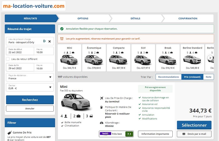 Simple et intuitive, elle permet de trouver facilement le modèle de voiture de location idéal grâce à un système de filtres. En quelques clics, il est ainsi possible de préciser ses critères : gamme de prix, type de transmission, kilométrage limité ou illimité, voiture classique, électrique ou hybride, climatisation, nombre de passagers, montant de la caution, franchise, etc.
