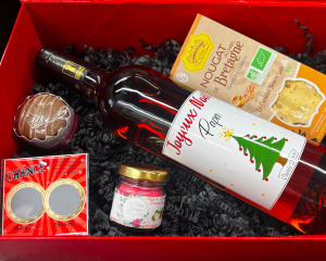 Ce coffret cadeau aimanté contient cinq cadeaux personnalisables : une bouteille de vin (rouge, blanc, rosé, pétillant), des cartes à gratter, du nougat de Bretagne, une bougie « mini confit », et un savon doux en forme de macaron.