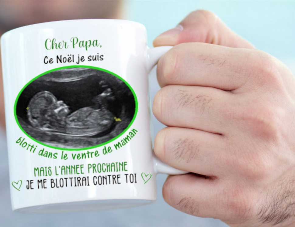 Ce mug de Noël permet de faire un cadeau unique à un futur papa… et même de lui annoncer une grossesse ! Il est personnalisé avec l’échographie de bébé, et est décoré d’un tendre message.