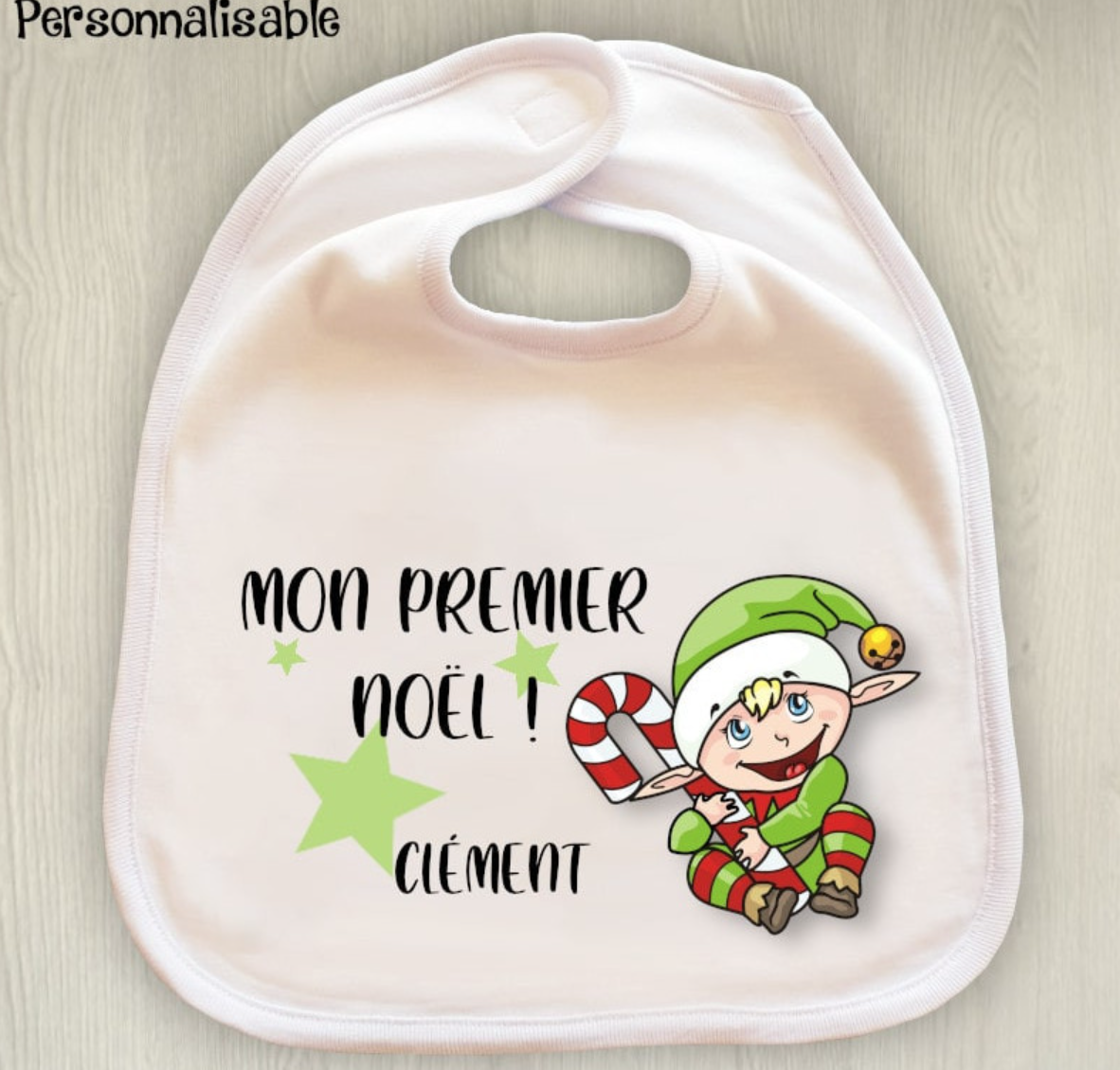 Ce bavoir orné d’un petit lutin malicieux est idéal pour célébrer le premier Noël de bébé. Il est personnalisable au prénom de l’enfant. La bordure se décline en trois coloris : rose, bleu ou blanc.