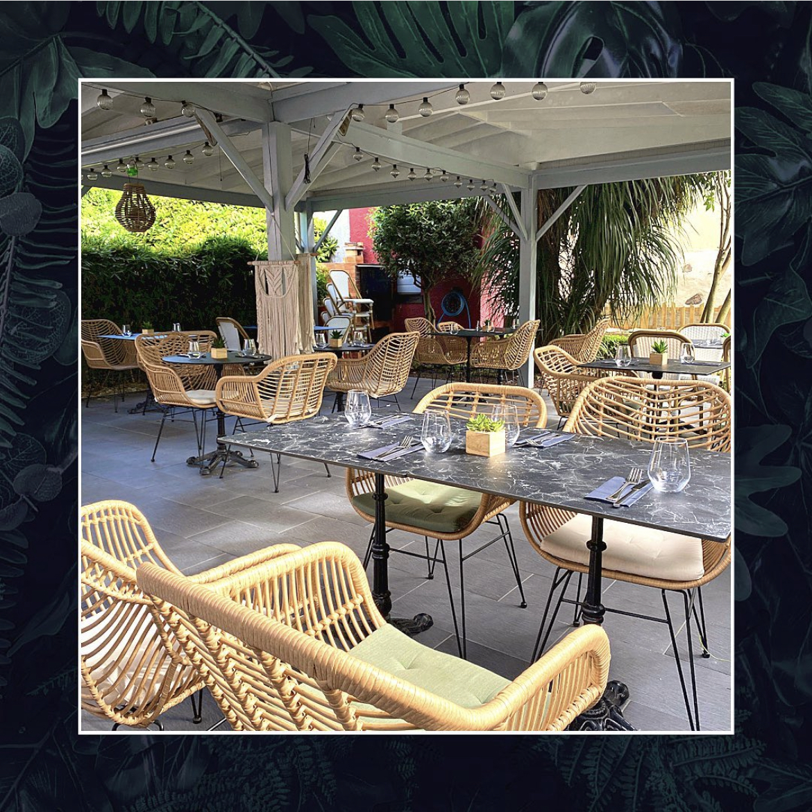Les clients prennent place à l’intérieur ou sur la jolie terrasse, dans un décor soigné, entourés d’une végétation luxuriante qui fait voyager.