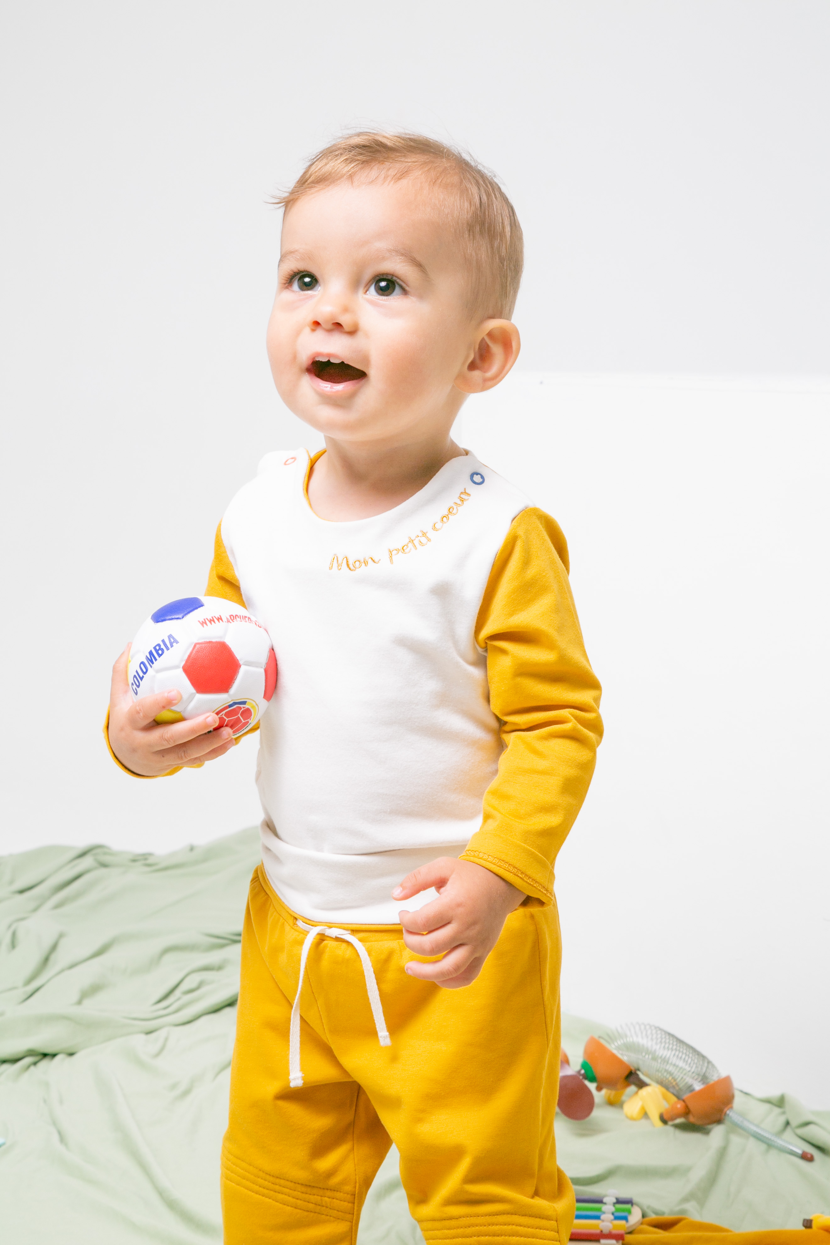 Description : Body évolutif composé à 93% de coton et 7% de lycra, ce vêtement grandit facilement avec l’enfant grâce à son élasticité naturelle et une couture spéciale à l’entrejambe et les cotes qui lui permet de s’étendre en douceur. Il est brodé autour du cou à l’avant l’expression “Mon petit cœur” et la meme expression en espagnol “Mi corazoncito” à l’arrière.