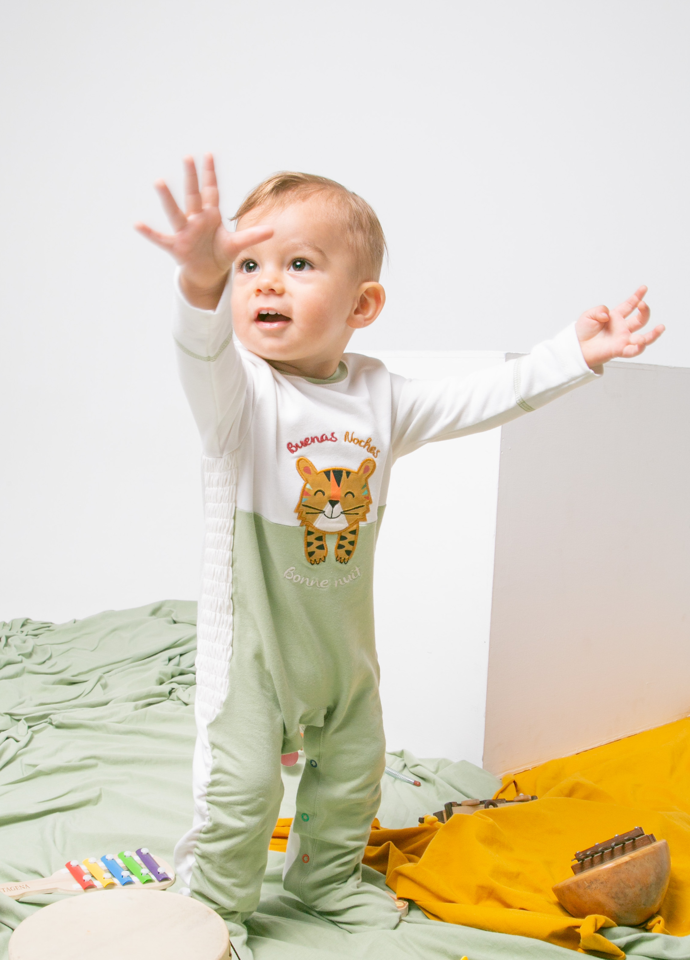 Description : Ce pyjama évolutif est également composé à 93% de coton et 7% de lycra, et a un tigre, animal de la jungle colombienne, brodé à l’avant avec l’expression “buenas noches” en espagnol et bonne nuit en Français, . Il s’ajust a la croissance de l’enfant grâce à son élasticité naturelle, une couture spéciale à l’entrejambe et les cotés, un élastique doux pour les jambes et une couture intelligente aux pieds, qui lui permet de pousser en douceur avec le bébé.