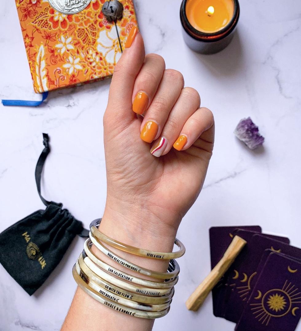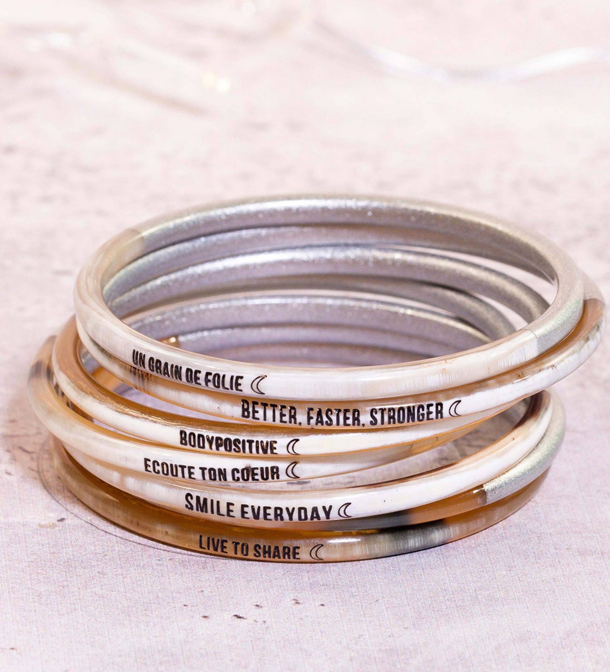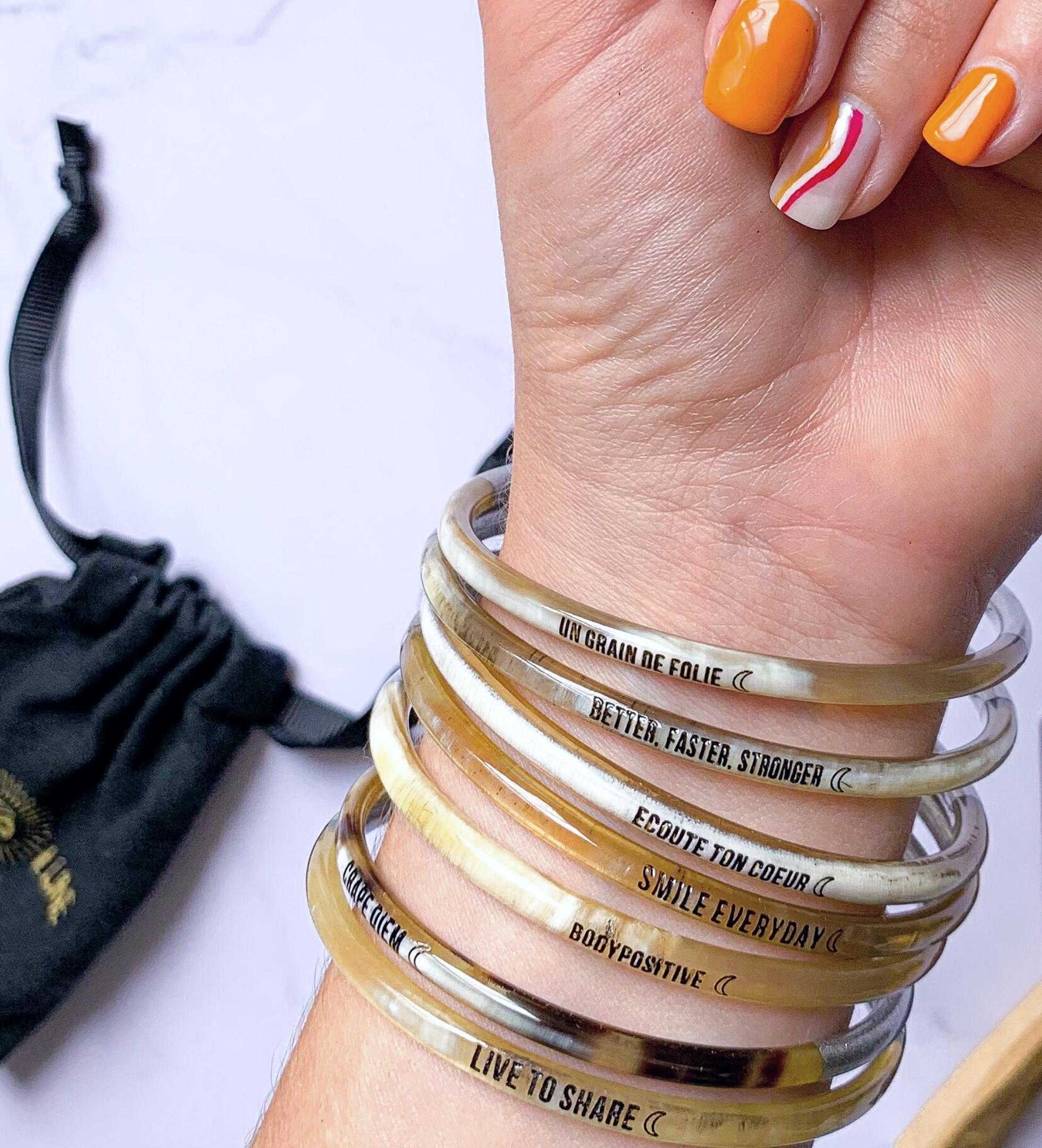 Gravés d’un mantra ou d’une affirmation positive, ces bracelets en corne sont fabriqués de façon artisanale au Vietnam. Ils peuvent se porter seuls ou à plusieurs, pour créer des superpositions de bracelets très tendance.