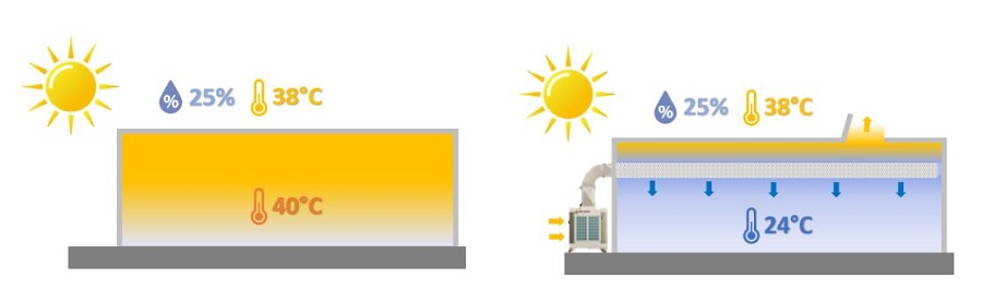 La solution ? Le refroidissement adiabatique. Il fonctionne tout simplement par évaporation, lorsque l’air chaud entre en contact avec l’eau (par vaporisation ou panneau humide). Au contact de l’air chaud, l’eau s’évapore et l’énergie nécessaire à l’évaporation des particules d’eau est puisée dans les calories présentes dans l’air chaud. L’air chaud perd alors des calories entraînant une baisse de sa température.