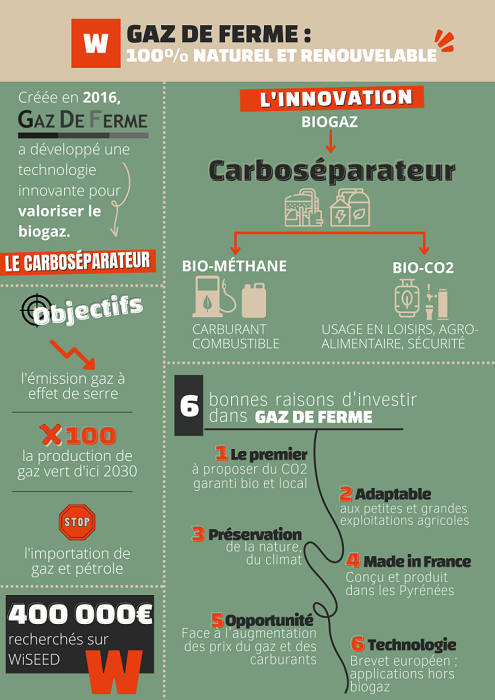 Dans un contexte très porteur, Gaz de Ferme a besoin de décupler ses fonds propres pour faire face à une forte demande et déployer sa solution. L’ouverture du capital en cours comprend un volet d’investissement participatif, lancé sur Wiseed, afin de collecter 400 k€ en 3 semaines.