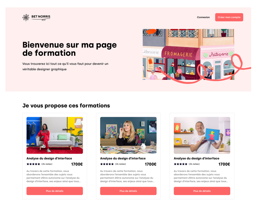 - Le catalogue. Chaque formateur bénéficie d’une page catalogue sur laquelle il peut présenter ses formations. Cette page peut être personnalisée au logo et aux couleurs de chaque formateur. Pour augmenter la visibilité de leur offre, les formateurs peuvent ensuite partager le lien de leur page MyKlub sur les réseaux sociaux.