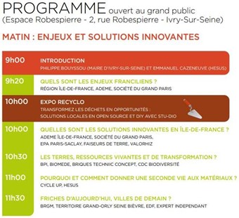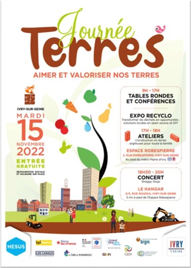 HESUS, avec ses partenaires, la REGION ILE DE FRANCE, l’ADEME IDF, la BPI, le BRGM, l’INEC, le territoire GRAND ORLY SEINE BIEVRE, les CANAUX, le cluster EAUX MILIEUX SOLS, le GISFI, la ville d’IVRY SUR SEINE et TERRES DE METAMORPHOSES lancent la 1ère édition de la JOURNEE TERRES, le 15 novembre à Ivry sur Seine.