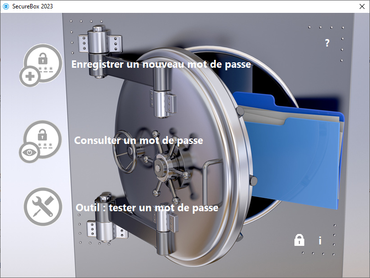 Coffre-fort numérique destiné la mise en sécurité des mots de passe, SecureBox 2023 permet également la génération de mots de passe sûrs et sécurisés ainsi que le test de leurs niveaux de sécurité.