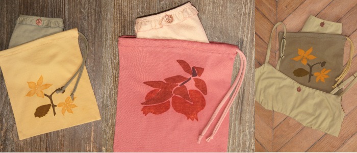 Le projet se concrétise quand Stéphanie a l’idée d’imprimer sur les pochettes les plantes utilisées dans les teintures qui les colorent. Après quelques échanges d’esquisses réalisées par l’atelier Bleu Grenade, les pochettes prenaient corps :