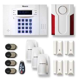 Centrale d’alarme avec sirène, 4 télécommandes design, 4 détecteurs d’ouverture, 3 détecteurs de mouvement, 1 sirène extérieure avec flash, 1 télécommande gros boutons, 2 autocollants.