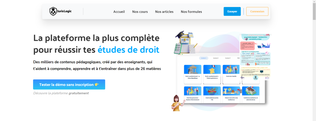 JurisLogic est la première solution qui donne aux étudiants toutes les clés pour réussir leur licence de droit. Elle conjugue simplicité et efficacité, en permettant aux étudiants d’accéder de façon illimitée à ses contenus, avec un abonnement à partir de 9,99 euros par mois. Certains de ses contenus sont disponibles gratuitement.