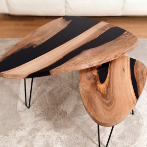 Ce duo de tables basses est composé de noyer massif européen et de résine epoxy teintée noire. Grâce à leur finition en huile/cire incolore, les tables disposent d’une très bonne résistance aux liquides. La grande table mesure environ 100x72cm pour 45cm de hauteur tandis que la petite, haute de 40cm, mesure environ 64x44cm.