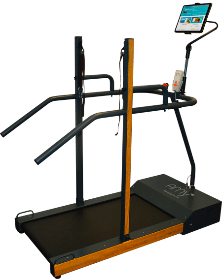Une application connectée à Amy accompagne le tapis roulant. Elle propose deux types de programmes, auxquels on peut accéder grâce à une tablette tactile installée devant le regard du marcheur :