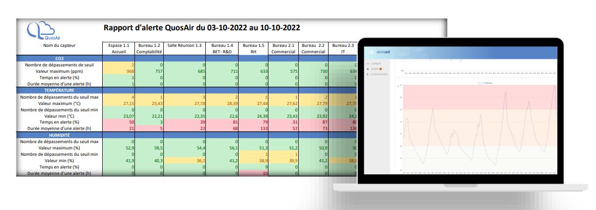 L’équipe QuosAir a souhaité accompagner dans cette démarche les entreprises et les collectivités dans le plus grand nombre de leurs bâtiments, même ceux dotés de systèmes de CVC manuels. Pour ce faire, nous permettons aux gestionnaires d’analyser la consommation énergétique de leurs bâtiments et leur QAI pour sensibiliser les occupants et changer leurs habitudes. Pour y parvenir, QuosAir propose une grande variété de capteurs capables de générer des alertes en temps réel et des tableaux de bords d’analyse des dépassements de seuils de température et de CO2, pièce par pièce. Ces analyses permettent d’identifier les espaces et moments de surchauffe en hiver, de sur-climatisation l’été et de lumières allumées sans présence à l’intérieur. A la lumière de cette analyse périodique, les gestionnaires de bâtiments peuvent cibler leurs actions de chasse au gaspi de manière chirurgicale et efficace.