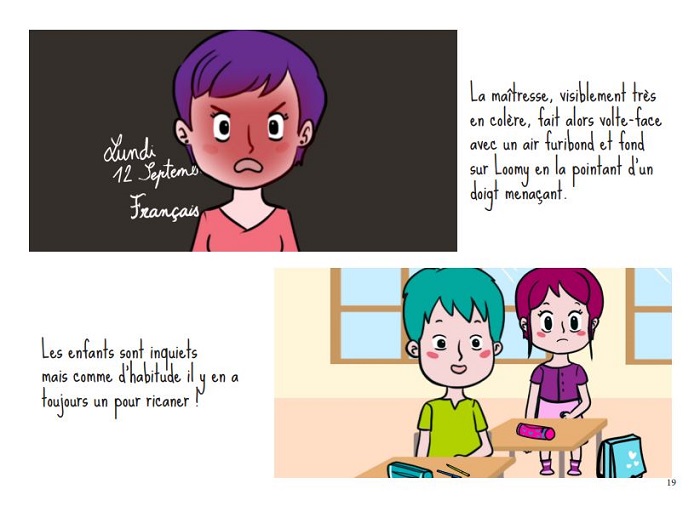 Dans un premier temps, les enfants n’ont pas besoin d’entrevoir les dimensions de leur lecture. Le mot harcèlement, par exemple, n’apparaît jamais. Ainsi, ils se laissent embarquer avec plaisir dans cette petite histoire.