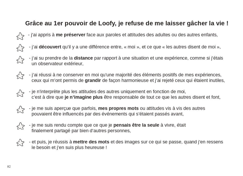 Mais, rares sont ceux qui conduisent l’enfant à réfléchir à la fois sur ses propres émotions mais aussi sur les sentiments de l’autre. Cette dimension empathique, essentielle non seulement au vivre ensemble mais également à la dédramatisation des événements que l’enfant est amené à rencontrer est une approche résolument alternative.”