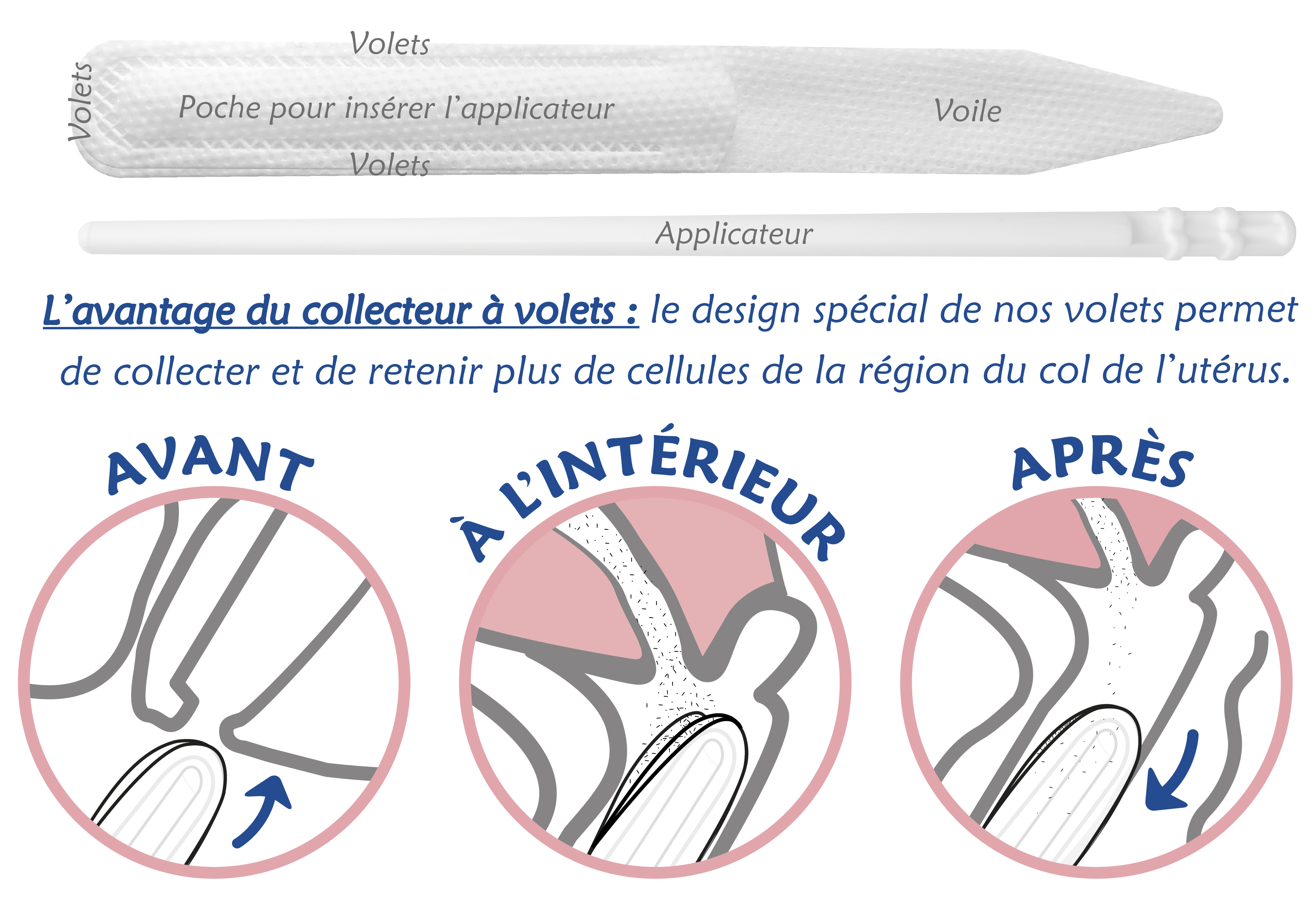 Inséré grâce à un applicateur dans la cavité vaginale, le Voile Vaginal Collecteur « V-Veil UP2 » va permettre de prélever des sécrétions, divers fluides et substances se trouvant dans le vagin et sur le col de l’utérus.