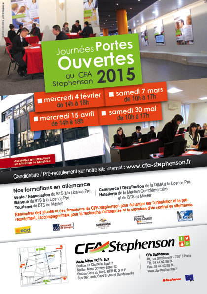 Les prochaines Journées Portes Ouvertes auront lieu le samedi 7 mars de 10h à 17h, le mercredi 15 avril de 14h à 18h, et le samedi 30 mai de 10h à 17h dans les locaux du CFA Stephenson au 48 rue Stephenson dans le 18ème arrondissement à Paris.