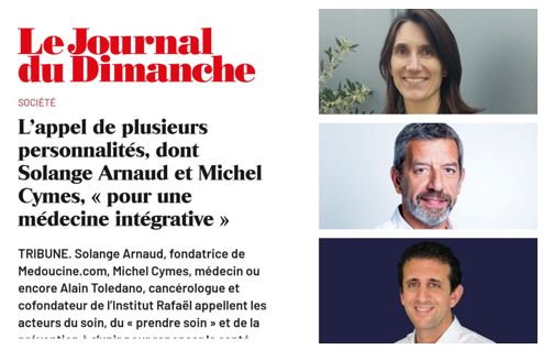 Le 13 novembre dernier, une tribune m l’initiative de la plateforme Medoucine.com a été publiée dans le JDD. Cette tribune appelant m rassembler tous les acteurs du soin et du prendre soin était co-signée par Solange Arnaud, fondatrice de Médoucine, Michel Cymes, médecin et Alain Toledano, cancérologue et cofondateur de l’institut Rafaël.