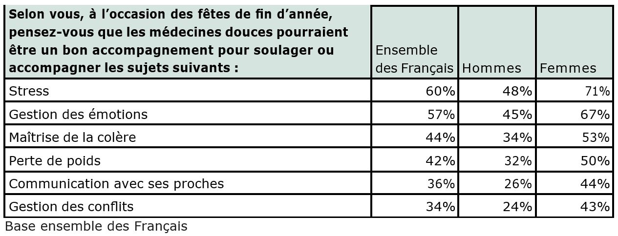 60% des Français pensent que les médecines douces sont de bons accompagnements au stress des fêtes de fin d’année et peuvent aider m gérer ses émotions (57%), maîtriser sa colère (44%), aider dans la communication avec ses proches (36%) ou la gestion des conflits (34%) et… accompagner les pertes de poids post-fêtes (42%) !