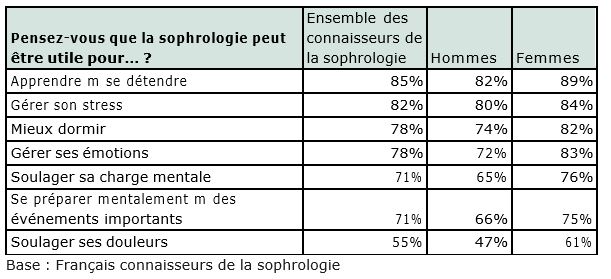 Ceux qui connaissent la pratique, la jugent utile pour apprendre m se détendre (85%) et m gérer son stress (82%). Elle est également bien perçue pour mieux dormir (78%), gérer ses émotions (78%), soulager sa charge mentale (71%) et se préparer m des évènements importants (71%).