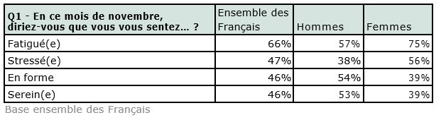 Les femmes en particulier se sentent majoritairement fatiguées (75% des femmes contre 57% des hommes) et stressées (56% des femmes contre 38% des hommes).