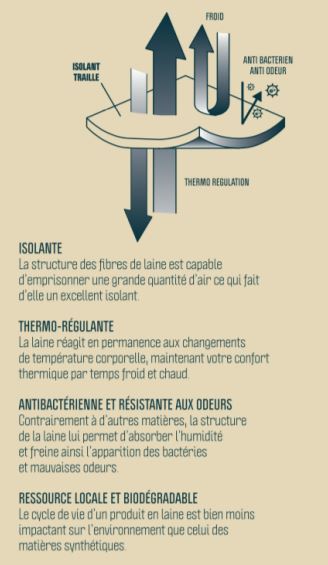 La laine est une matière naturelle aux propriétés exceptionnelles puisqu’elle est à la fois thermo-régulante, isolante, respirante et légère, résistante et élastique, capteuse d’odeurs, non allergisante et peu perméable à l’eau.