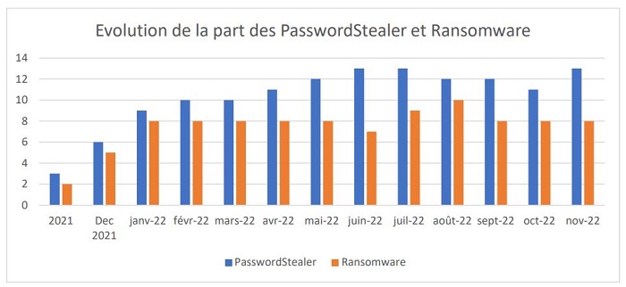 - Un utilisateur a 6 fois plus de risque d’être exposé à un malware de type Password Stealer et 4 fois plus de risque d’être exposé à un malware de type ransomware par rapport à l’année 2021.