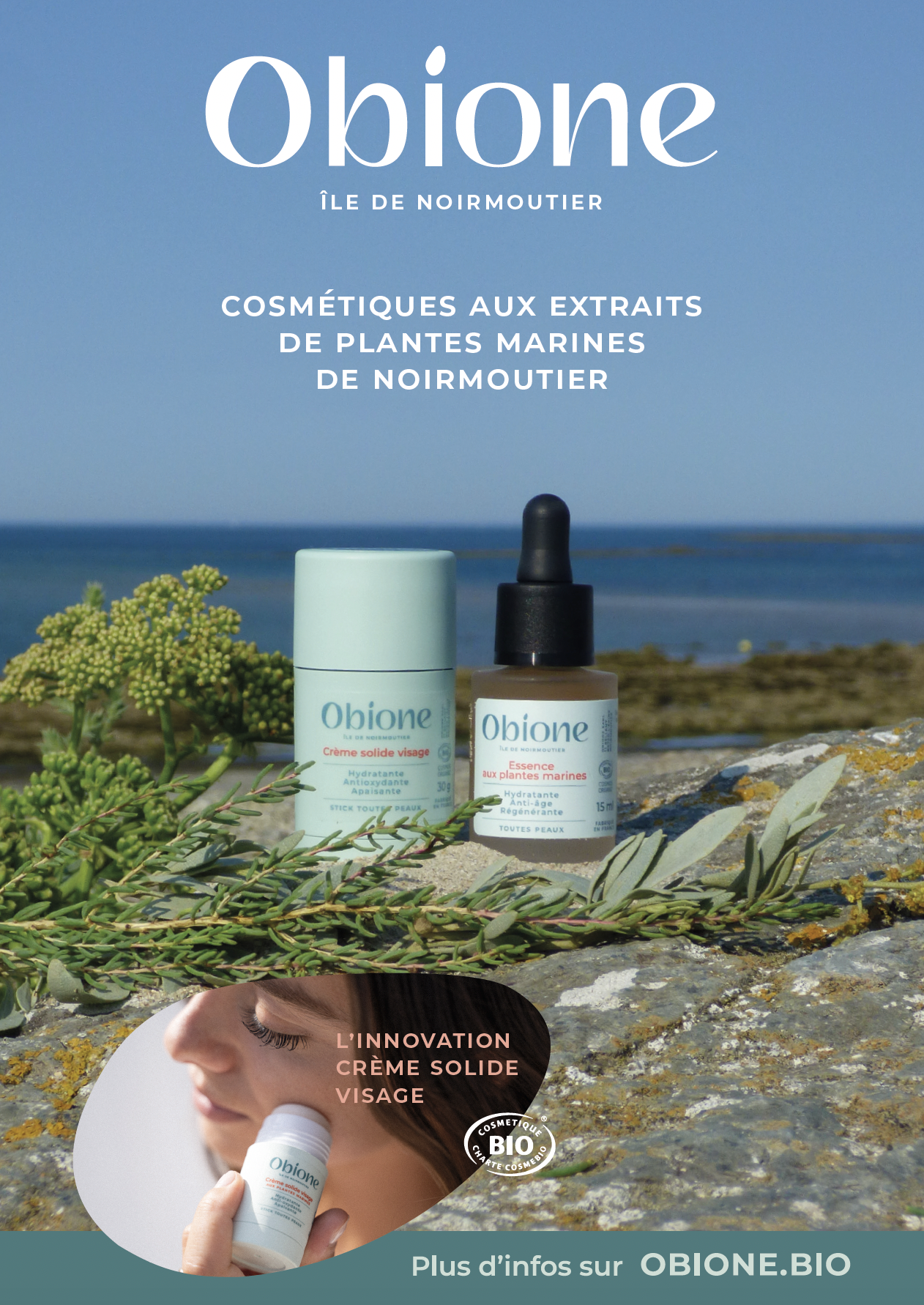 Lancée en juillet 2022, Obione est la première marque qui puise les bénéfices de ses produits dans la force des halophytes, des plantes à la richesse extraordinaire qui résistent au sel marin. Elle tire son nom de l’obione, l’une des espèces de plantes dont est extrait son phytocomplexe actif.